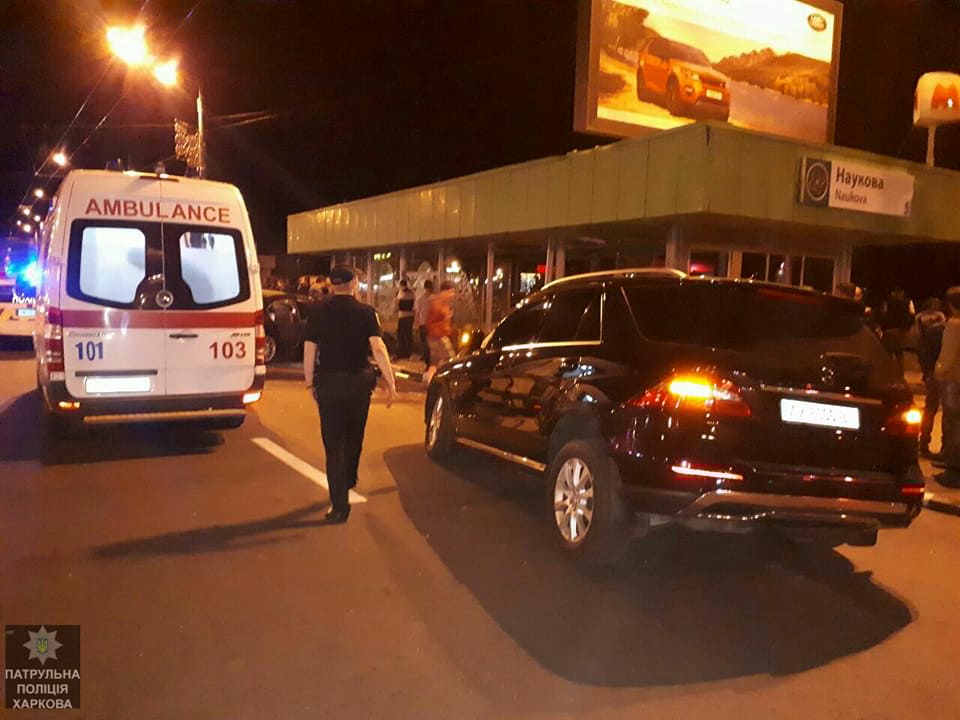 В результате столкновения BMW отбросило на ограждение, после чего автомобиль врезался в выход станции метро. С места аварии в больницу были доставлены водитель и двое пассажиров BMW, а также водитель Mercedes.