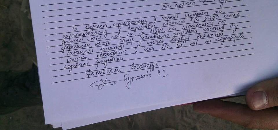 В четверг, 22 июня в комментарии под постом с заявлением Валерия Бурлакова опубликовала фото пояснений, которые касются обещаний бойцов покинуть расположение части. В нем, в частности, отмечается, что бойцы под словами о желании покинуть часть 2970 имели в виду исключительно законные способы - перевод в другие части, на котрые бойцы неоднократно подавали заявления командованию.