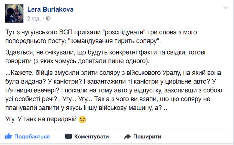 В еще одном посте Валерия Бурлакова описала реакцию "ответственных лиц" на слова о краже топлива в части:
