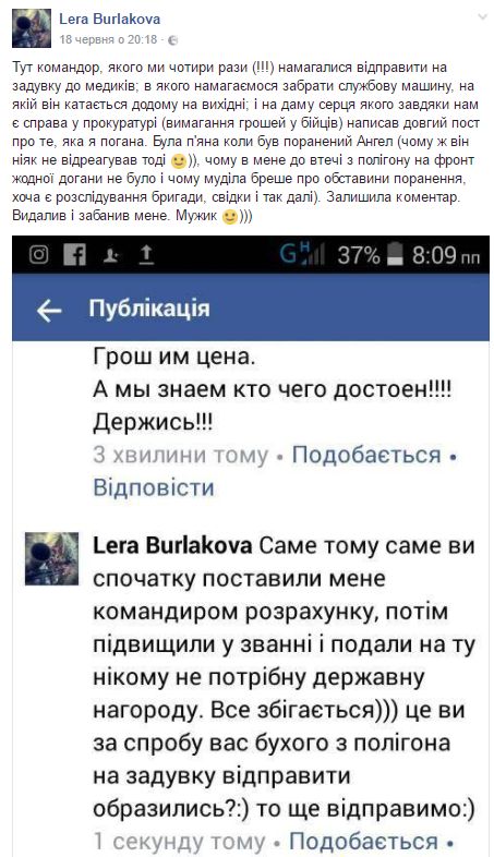 Кроме того, еще в одном комментарии к указанному посту Бурлакова высказала мнение о том, что командование "специально" разбрасывает бойцов: