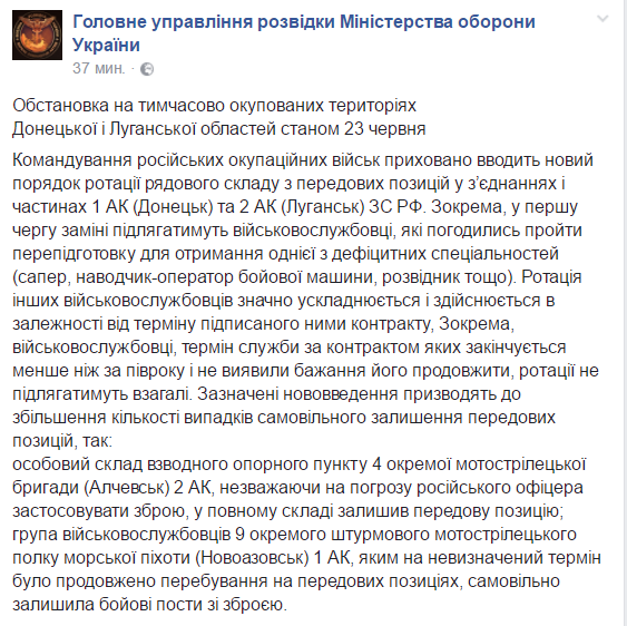 В разведке подчеркнули, что указанные нововведения приводят к увеличению количества случаев самовольного оставления боевиками передовых позиций и боевых позиций в частях.