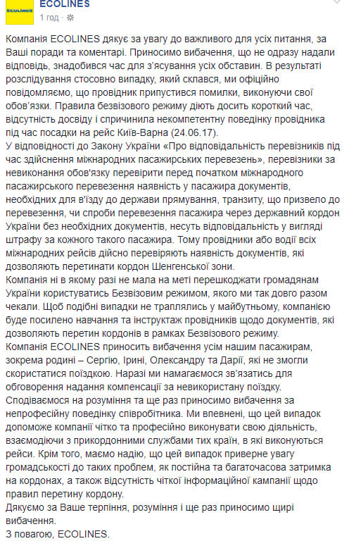 Компания Ecolines обещает не повторить случаев недопуска на рейсы пассажиров с биометрическими паспортами, а пострадавшим обещают компенсацию поездки. Об этом говорится в официальном сообщении с извинениями, которое перевозчик разместил на своей странице в Facebook.