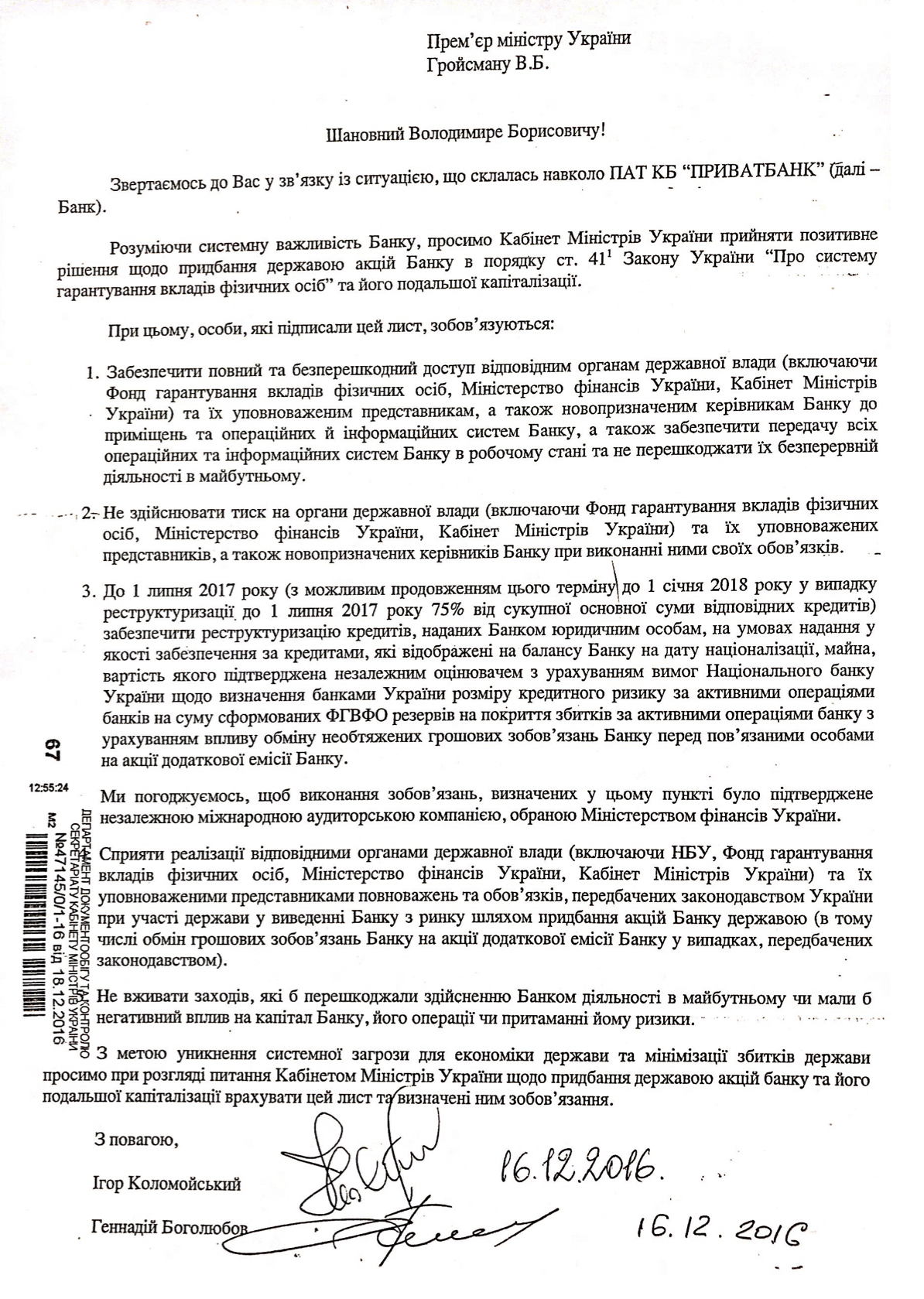 Министерство финансов Украины обнародовало письмо от 16 декабря 2016 года премьер-министру Украины Владимиру Гройсману от бывших крупнейших акционеров Приватбанка Игоря Коломойского и Геннадия Боголюбова с просьбой приобрести акции банка и принять положительное решение по его дальнейшей капитализации.