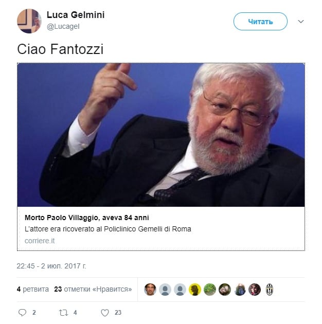 Итальянский комедийный актер Паоло Вилладжо, известный по образу Уго Фантоцци, умер на 85-м году жизни в римской больнице "Джемелли".