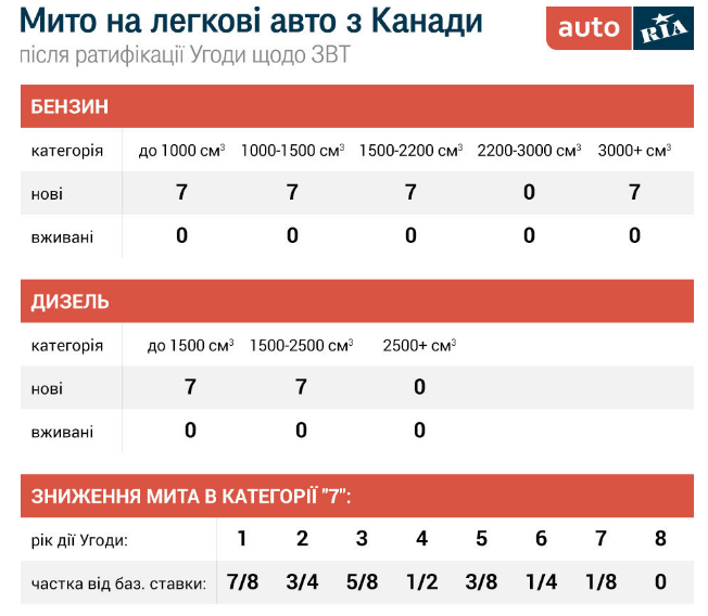 Индекс "7" на инфографике означает, что в течение следующих семи лет пошлина будет снижаться постепенно, в соответствии с графиком, и на восьмой год действия соглашения также станет нулевой.