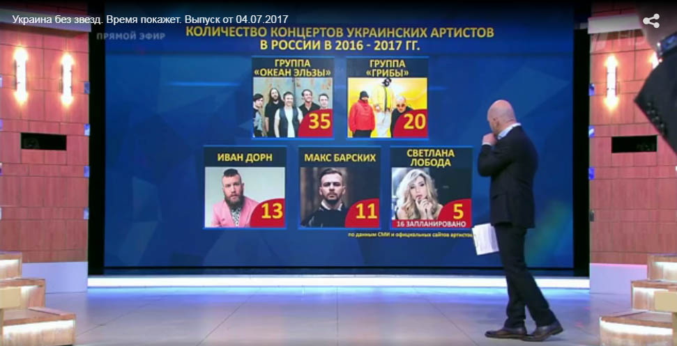 В качестве подтверждения своих слов редакторы шоу вывели на экран инфографику, в которой в том числе утверждалось, что за 2016-2017 годы украинская группа «Океан Ельзи» дала в России 35 концертов. «