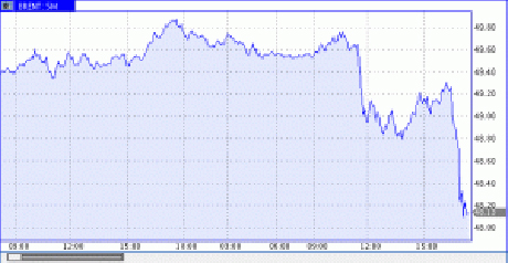 По состоянию на 17.15 5 июля по киевскому времени фьючерс на марку Brent с поставкой в сентябре подешевел почти на 2% — до 48,1 долл за баррель. Полюбуйтесь на эту картинку: