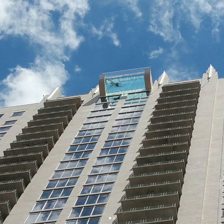 Архитекторы, придумавшие это неистовство, имели своеобразное чувство юмора, сделав сооружение полностью из стекла. Человек, который заходит в бассейн, как будто движется в воздухе на высоте более 120 метров. Необычный бассейн появился в США.