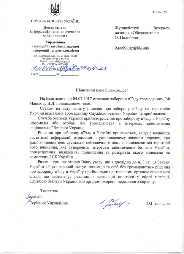 "На ваш запрос от 04.07.2017 по гражданину Машкову В.Л. сообщаем следующее. По состоянию на дату запроса, указанному гражданину решение о запрете по въезду на территорию Украины не выносилось", — сообщили в спецслужбе.