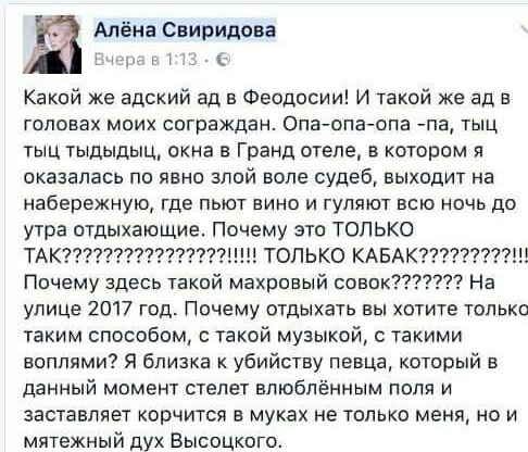 «Понимаете, Алена Свиридова, вы очень точно подметили, что на улице 2017 год. И, тем не менее, вы считаете нормальным в 2017 году поддерживать завоевательную похоть этой совковый недоимперии и гастролировать на оккупированных территориях, которые аннексировал себе этот совковый мутант, т.е. вы являетесь абсолютно органичной по смыслу и духу частью этого режима, который сохранил в себе и приумножил все черты советского общества и советской политики. Поэтому не стоит так удивляться быдлу - вы для него пели, поете и будете петь. А то, что в обществе вы ведете себя немного приличнее, чем они - ни о чем не говорит.