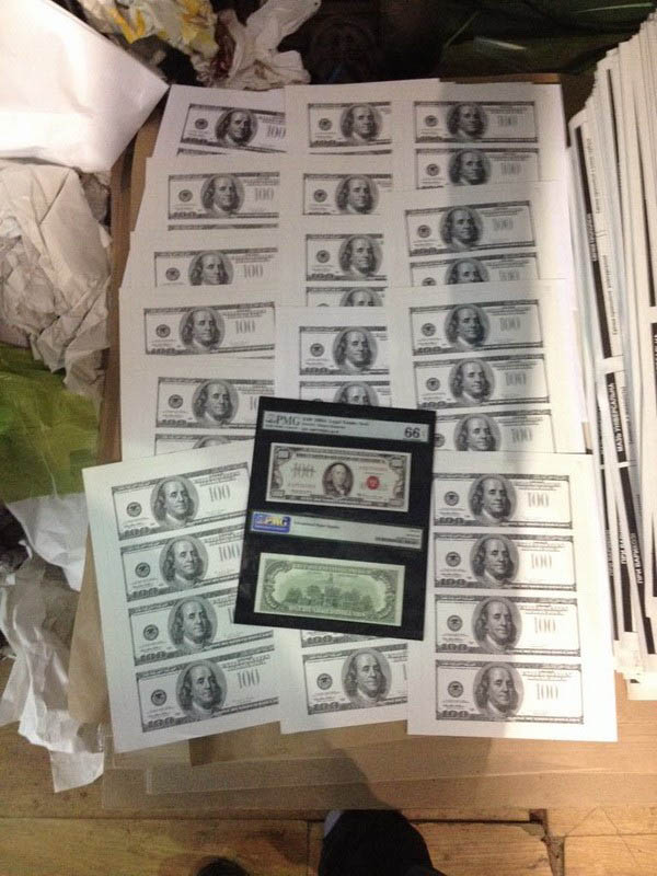 Правоохоронці провели 15 обшуків у помешканнях та офісах ділків. Вилучено банкноти із ознаками підроблення, а також численні знаряддя та витратні матеріали для виготовлення фальшивок, зокрема: кліше, прозорі плівки із зображеннями банкнот, спеціально підготовлені аркуші паперу із нанесеною розміткою контурів купюр та відтисками портрета президента Франкліна, комп’ютерну техніку тощо.