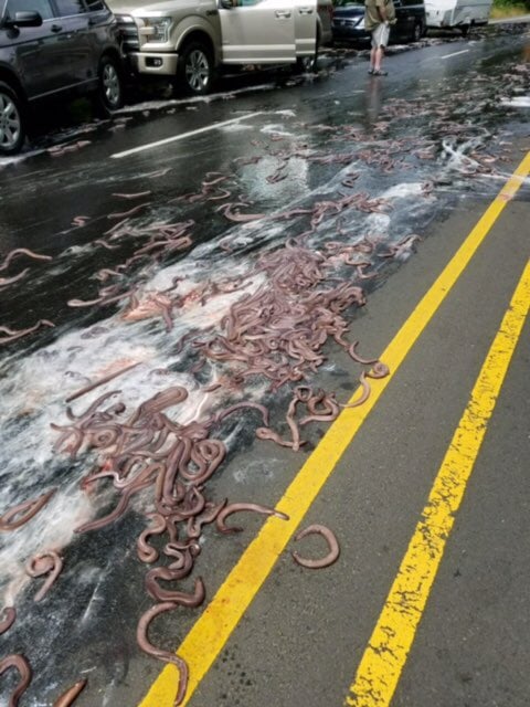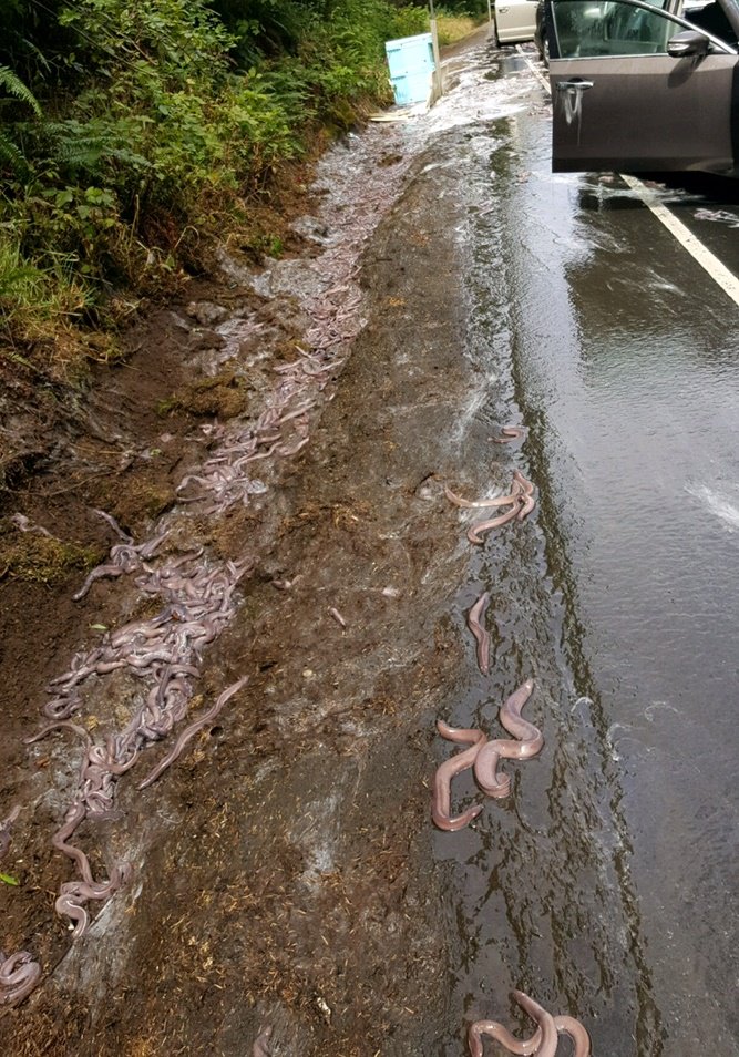 Беспозвоночные быстро покрыли всю проезжую часть толстым слоем слизи, чем вызвали столкновение нескольких автомобилей.