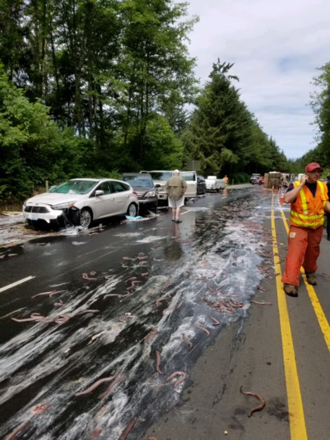 OSP @OregonDOT & @LincolnCountySO on scene overturned #Slime #Eel truck Hwy101 MP131 closed. #Cleanup on Aisle 101 pic.twitter.com/Z9s9XbQ247