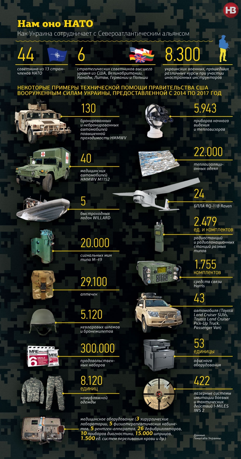 По словам главы проектного офиса реформ Минобороны Андрея Загороднюка, в целом, в ВСУ поступало оборудование на сотни миллионов долларов: радарные установки стоимостью до $ 1 млн каждая, приборы ночного видения, автомобили HMMWV, системы связи, беспилотные летательные аппараты.