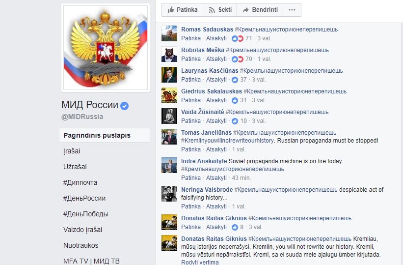 Инициатор акции журналист Андрюс Тапинас на своей странице призвал всех жителей Литвы пойти на страницу МИД РФ в Facebook и оставить пос информацией о партизанах запись #Кремльнашуисториюнеперепишешь.