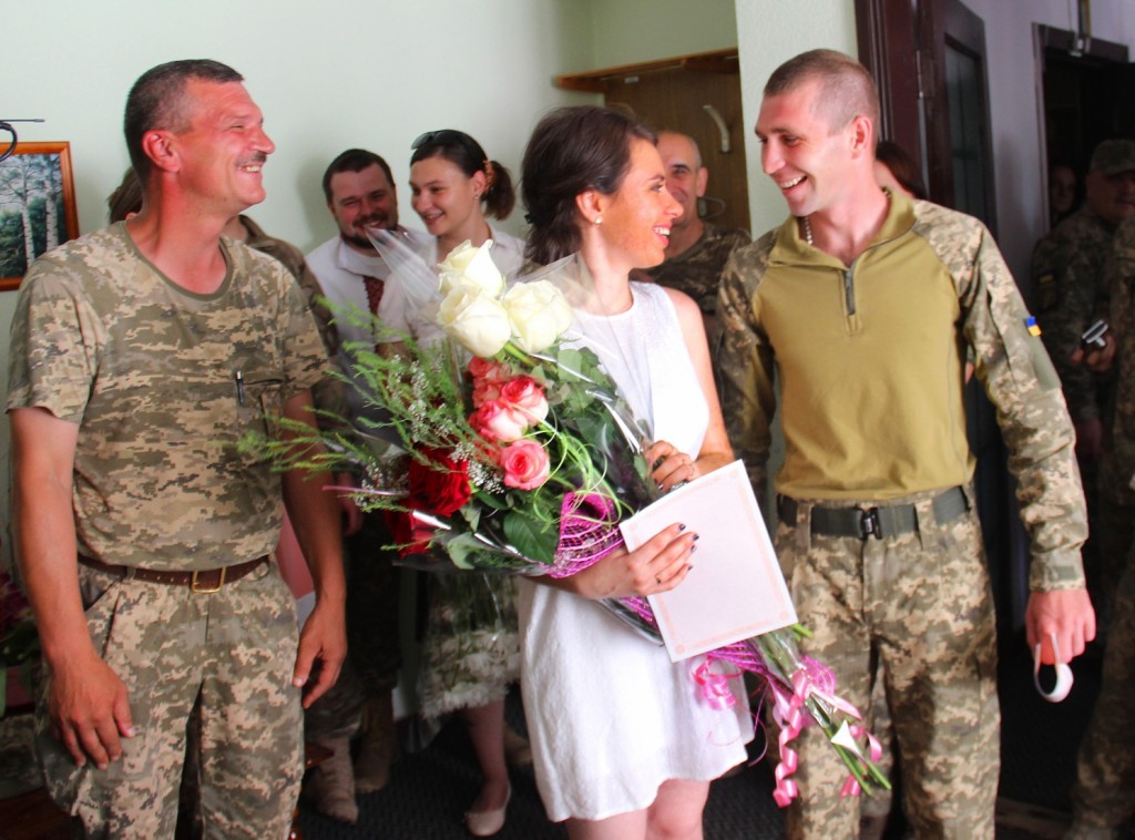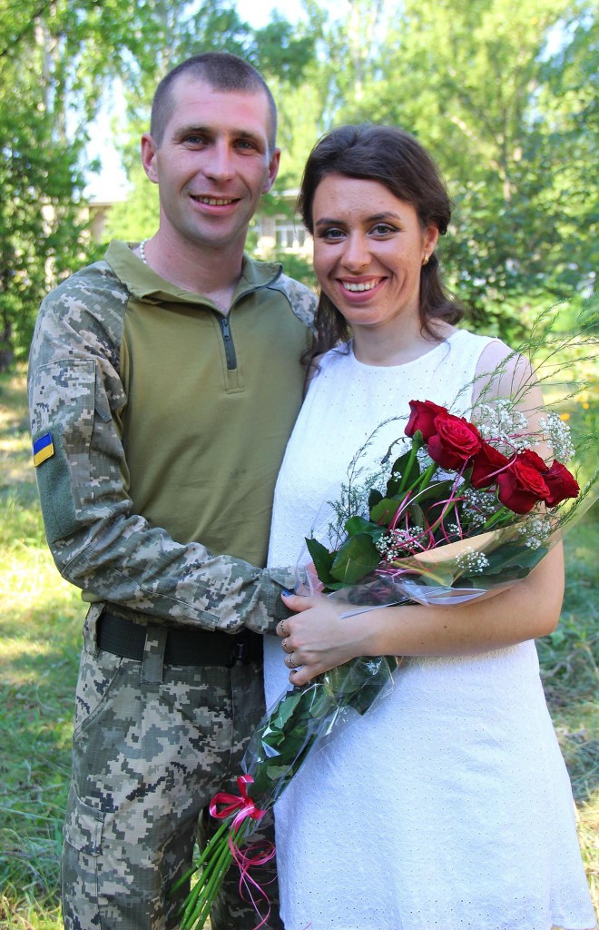 Прес-група штабу АТО випадково натрапила на молодят біля місцевого “ЗАГСУ”. Флеш-фотосесія для наречених, невеличке інтерв’ю та привітання бойових побратимів пройшли дуже швидко, але надзвичайно тепло, душевно, зі сльозами на очах…