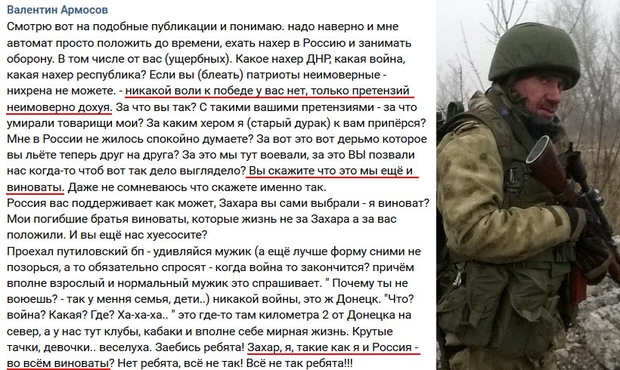 "За что вы так? С такими вашими претензиями - за что умирали товарищи мои? За каким х*ом я, старый дурак, к вам приперся? Мне в России не жилось спокойно думаете? За вот это вот д*ьмо, которое вы льете сейчас друг на друга? За это мы тут воевали, за это вы позвали нас когда-то, чтоб вот так дело выглядело? Вы скажите, что это мы еще и виноваты", — написал террорист.