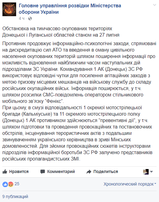 "Информация распространяется, в т.ч. путем рассылки СМС-сообщений оператором сотовой мобильной связи "Феникс", - уточнили в разведке.