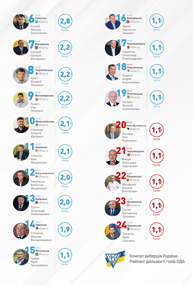 Также по данным рейтинга места в конце заняли Ивано-Франковская (Олег Гончарук), Черновицкая (Александр Фищук), Ровенская (Алексей Муляренко), Волынская (Владимир Гунчик) и Черкасская (Юрий Ткаченко) области.