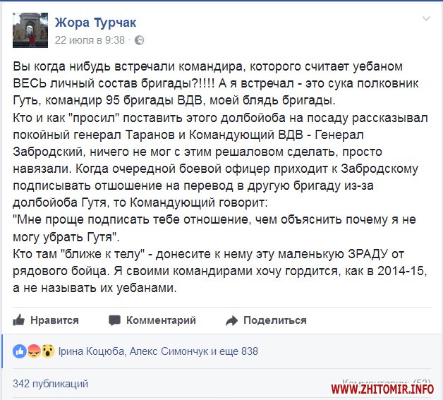 Ще 22 липня Жора Турчак написав пост про те, що бойові офіцери переходять в інші бригади через командира бригади Олега Гутя.
