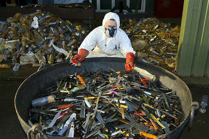 Для сбора материалов полицейские участки совместно с центром металопереработки в Шропшире запустили акцию «Спаси жизнь, сдай свой нож». Программа была полностью анонимной. На лезвиях некоторых из ножей выгравированы имена жертв преступлений. После сбора материала все ножи были тщательно очищены и затуплены.