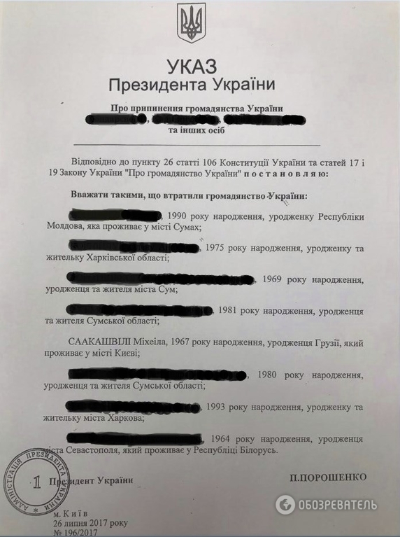 Кроме экс-президента Грузии в указе Порошенко сказано о лишении гражданства Украины еще семи человек, двое из которых - харьковчане, трое - жители Сумщины.