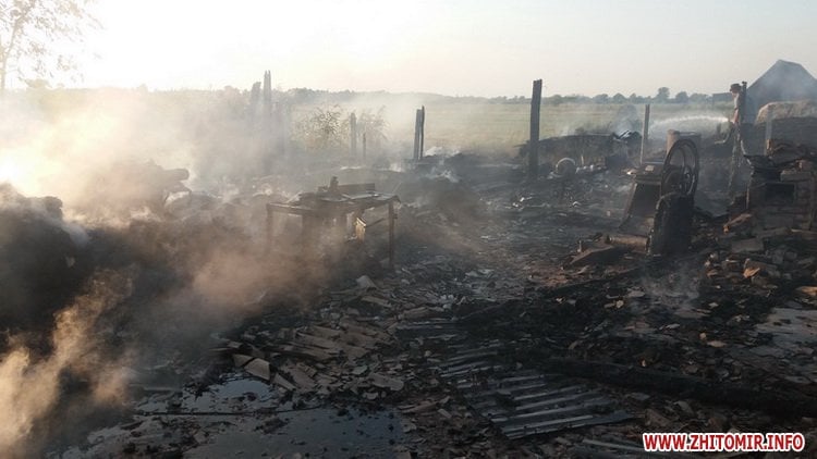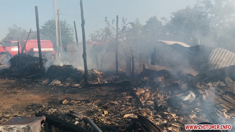 «2 серпня о 16:15 до Служби порятунку «101» надійшло повідомлення про пожежу в приватному домоволодінні в с. Острожок Баранівського району. Про це рятувальників сповістила дружина власника, яка побачила вогонь на даху дерев’яної господарської будівлі, розташованої навпроти житлового будинку на відстані 5 м. На місці події вогнеборці встановили, що господарська будівля повністю охоплена вогнем. До того ж, він встиг поширитися на дерев’яний сінник, де зберігалося 15 тонн сіна, та веранду житлового будинку. Через велику площу займання та складну пожежну навантаженість дерев’яних будівель керівник гасіння пожежі прийняв рішення залучити на допомогу додаткові сили та засоби», - інформує УДСНС.