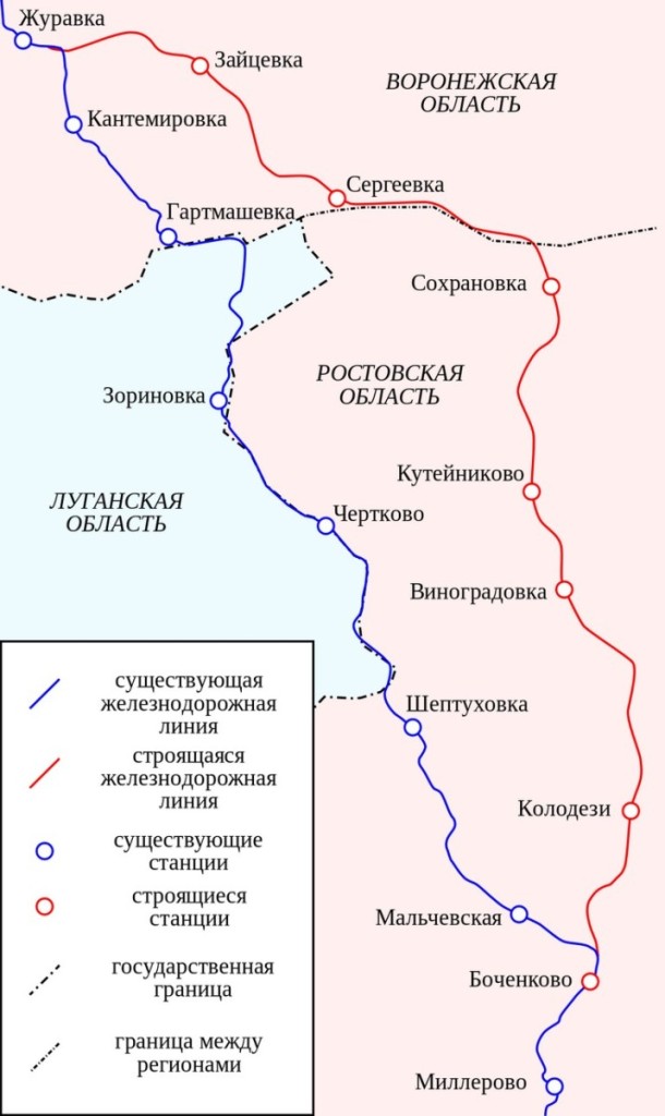 Напомним, небольшой участок железной дороги, связывающей Москву с Адлером, длиной 37 км, проходит по территории Украины в Луганской области. В 2015 г. Россия начала строительство альтернативной ветки железной дороги, полностью проходящей по территории РФ. В понедельник, 7 августа 2017 г., стало известно, что железная дорога в Ростовской и Воронежской областях, построенная в обход территории Украины, введена в строй.