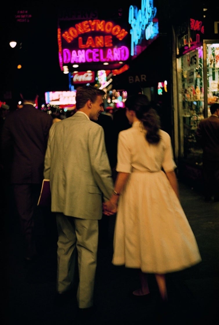 Подростки прогуливаются по ночному Нью-Йорку, 1957 год