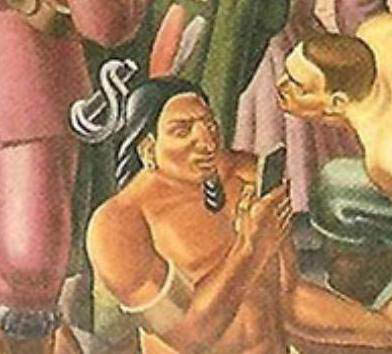 Принять прямоугольную табличку у него в руке за что-то другое не получается. Более того, на картине изображен связанный мужчина, который пытается заглянуть в экран телефона, как будто индеец смотрит на нем что-то очень интересное. Остальные герои произведения Романо на индейца и айфон у него в руке не обращают никакого внимания.