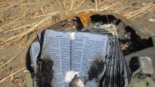 На выходе из Иловайска в урочище Червона Поляна волонтеры обнаружили обгоревшую Библию, текст которой сохранился.