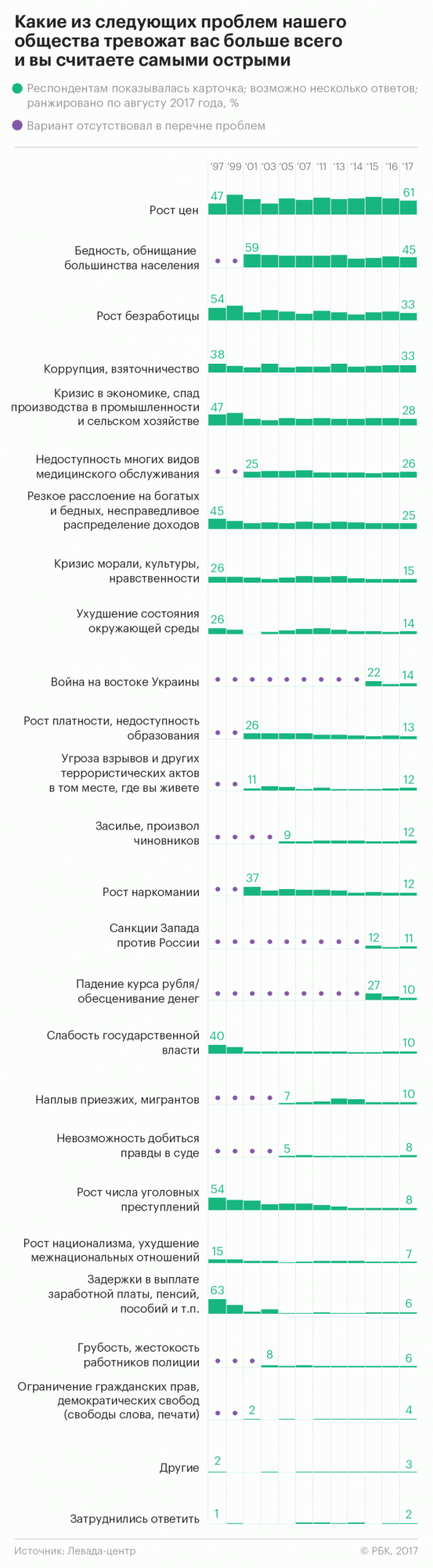 Исследование о том, какие из проблем тревожат россиян сильнее всего, было проведено социологами Левада-центра в августе 2017 года (есть у РБК). В нем приняли участие 1600 человек старше 18 лет в 48 регионах.