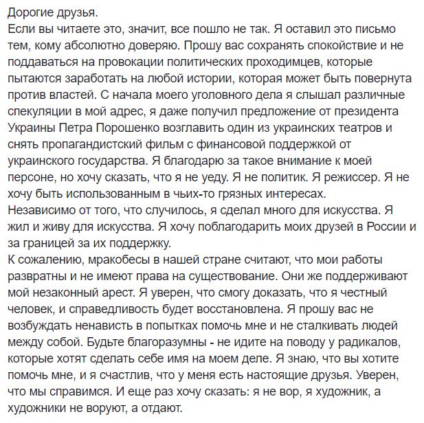 "После возбуждения уголовного дела я слышал различные измышления относительно себя, - далее говорится в документе. - Я даже получил от президента Украины Петра Порошенко предложение возглавить один из украинских театров и снять пропагандистский фильм при финансовой поддержке государства. Я признателен за такое внимание к моей персоне, но хочу сказать, что я не намерен уезжать. Я не политик. Я режиссер. Я не хочу, чтобы меня использовали в чьих-либо грязных интересах".