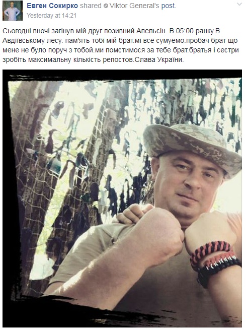 «Сегодня ночью погиб мой друг с позывным «Апельсин». В 5:00 утра. В Авдеевском лесу. Память тебе мой брат. Ми все скучаем. Извини, брат, что меня не было рядом с тобой. Мы отомстим за тебя брат. Братья и сестры сделайте максимальное количество репостов. Слава Украине», - написал его побратим.