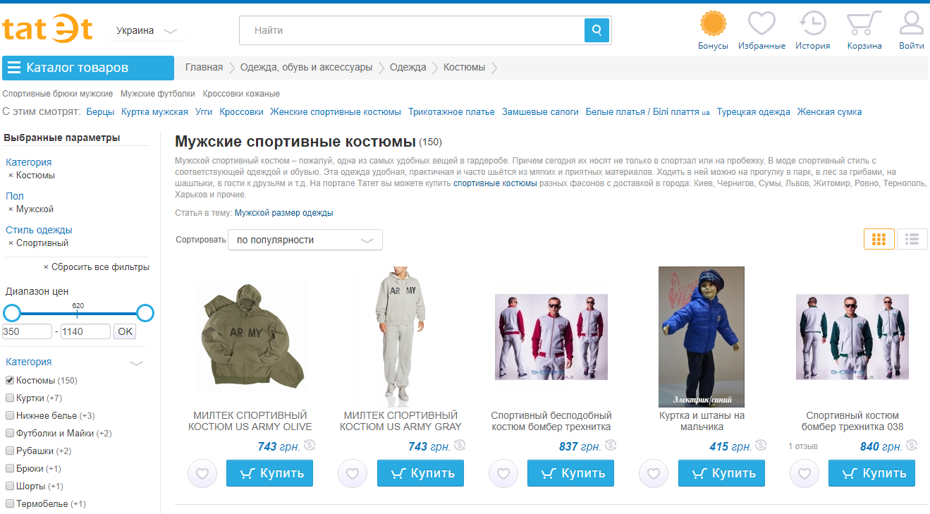 Современные фирменные магазины довольно скупы на количество моделей, придется преодолеть пешком ни один и не два квартала, чтобы оценить весь ассортимент мужских спортивных костюмов. Куда проще заглянуть на страницу маркетплейса Tatet.UA в каталог, где можно выбрать что-то подходящее не только по размеру, но и по стилю.