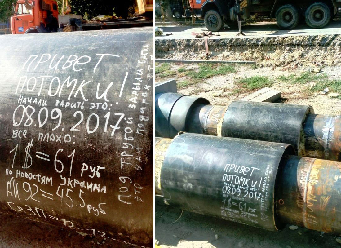 В Волгограде рабочие компании «Концессии теплоснабжения», меняющие трубы теплопровода, оставили послание потомкам. Они написали его белым маркером на одной из труб, которую заварили 8 сентября 2017 года. Фотографии с посланием опубликовала активистка Алина Духовная.