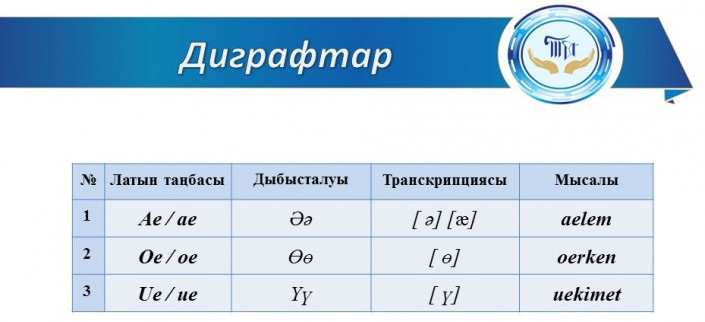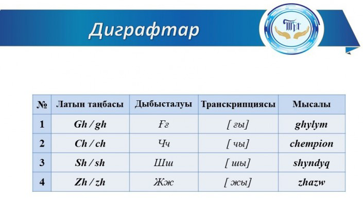 Например, гласные "ә", "ө", "ү" будут обозначаться как "ае", "oe", "ue" соответственно. Специфический звук "ң" будет передаваться как "ng", звук "ғ" - как "gh". Всего для полноценного обеспечения звуковой системы казахского языка в алфавит было включено восемь диграфов, обозначающих восемь специфических звуков (в том числе знакомые украинцам "ч", "ш" и "ж").