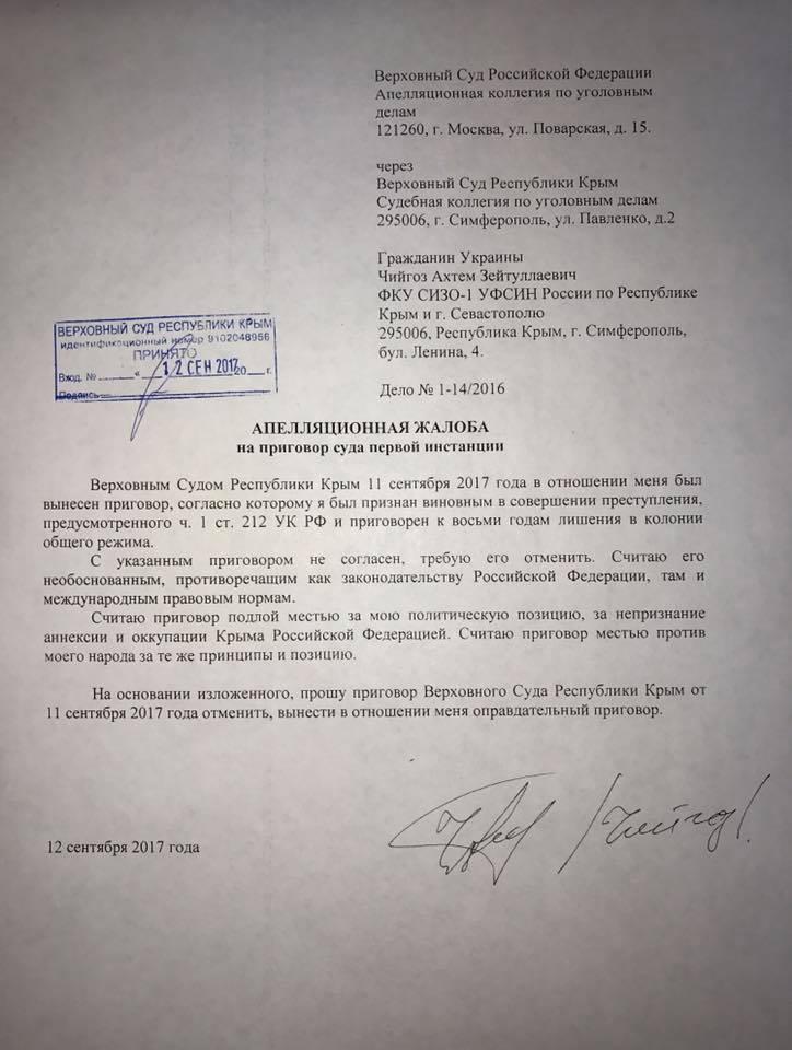 "Считаю приговор подлой местью за мою политическую позицию, за непризнание аннексии и оккупации Крыма Российской Федерацией. Считаю приговор местью против моего народа за те же принципы и позицию", - написал Чийгоз в своей жалобе, адресованной Верховному суду РФ.