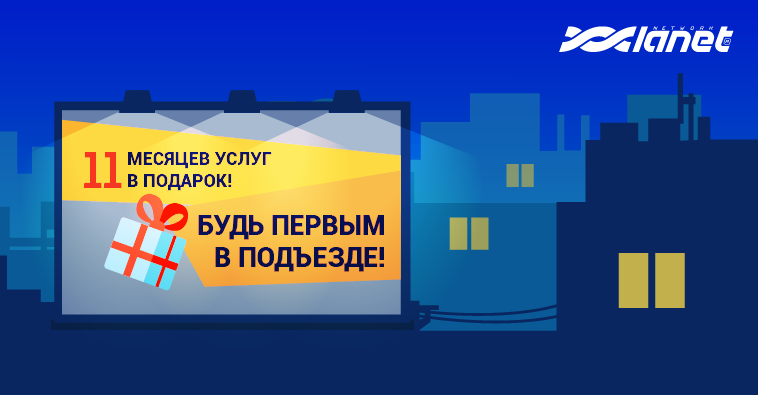 Проект «Первый в подъезде» адресован новым клиентам. Подключившись к Сети Ланет, клиент получает возможность бесплатно пользоваться услугами компании в течение одиннадцати месяцев.