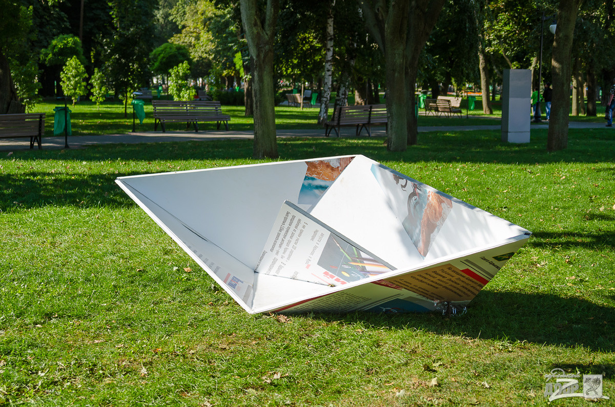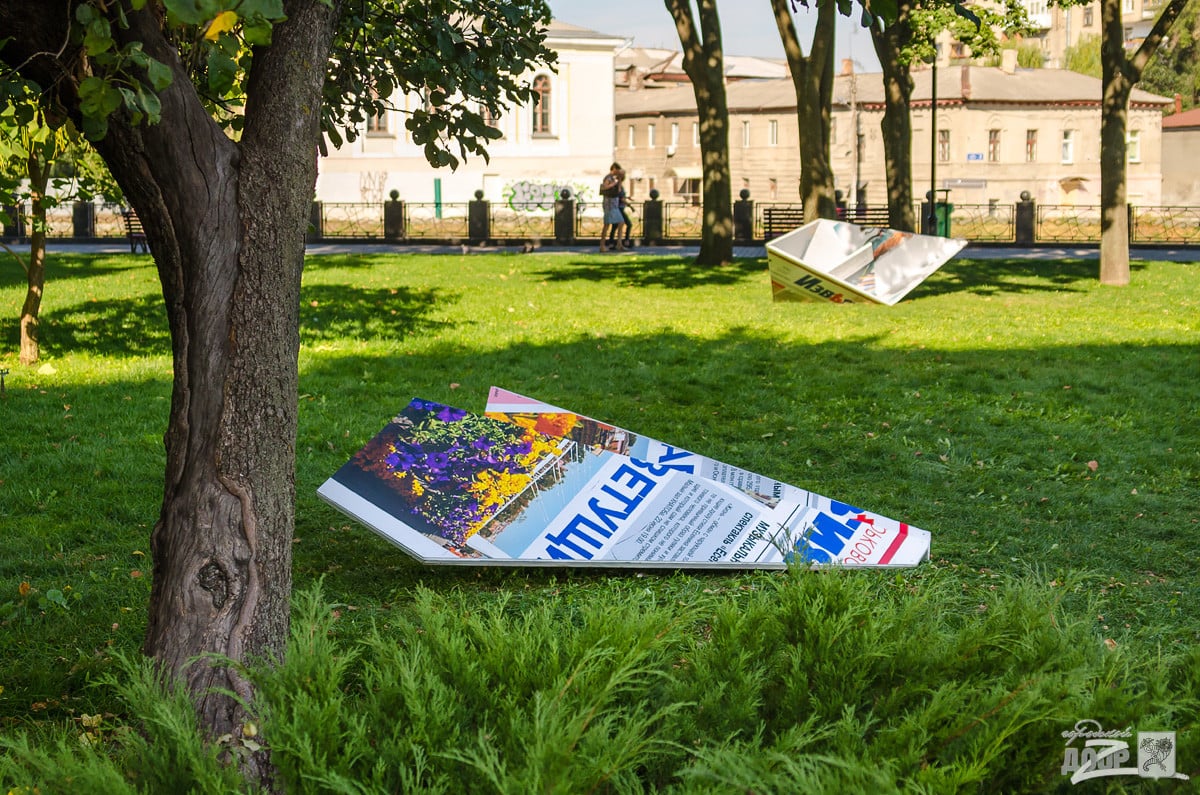 На этот раз, как пишет Городской дозор, в парке «Стрелка» появились гигантские бумажные «самолетик» и «лодочка», выполненные из коммунальной газеты «Харьковские Известия», а также группа ежиков.