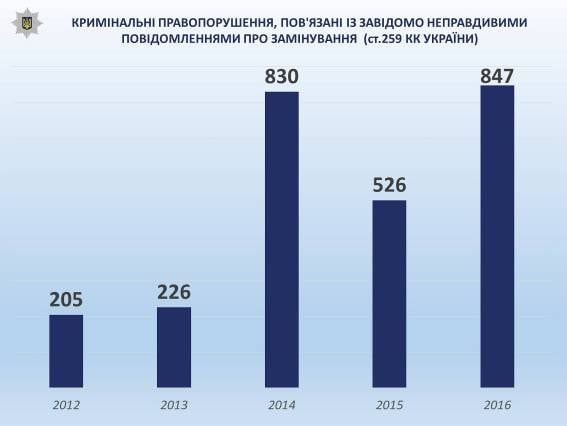 Перший заступник Голови Нацполіції вказав, що з початку 2017 року поліцією вже направлено до суду 57 справ цієї категорії злочинів, а у 183 випадках кримінальні провадження завершено. Водночас, зловмисникам повідомлено про підозру 16% зареєстрованих правопорушень про «замінування».