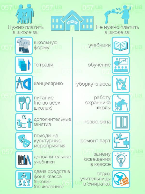 Нужно платить в школе за: школьную форму, тетрадки, канцелярию, питание (не во всех школах), дополнительные занятия, походы на культурные мероприятия, дополнительные учебники, по желанию сдача средств в фонд класса (школы).