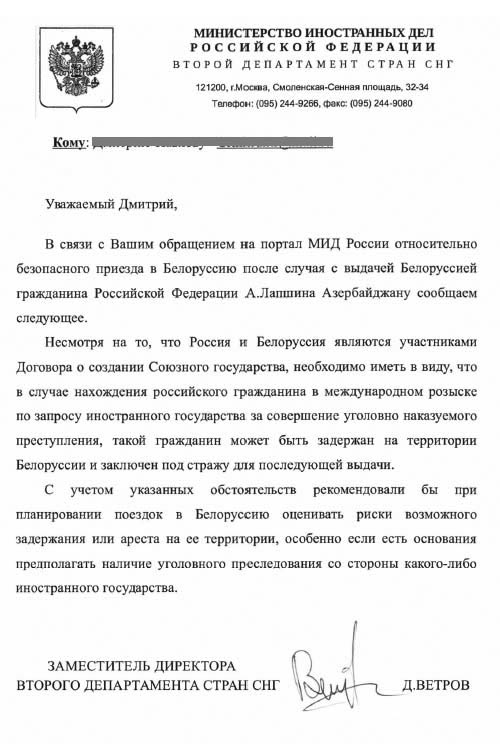 Об этом сообщается в ответе МИД РФ на запрос россиянина Дмитрия, который поинтересовался, насколько безопасно ездить в Беларусь после случая с экстрадицией блогера Александра Лапшина.