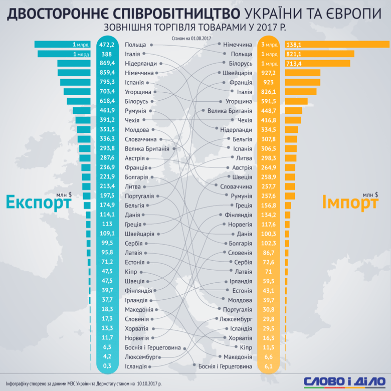 Серед аналізованих країн в лідерах за показниками як імпорту так і експорту опинилися Німеччина, Польща, Білорусь, Італія та Угорщина. Причому, український експорт до Польщі цьогоріч уже сягнув 1,472 млрд дол., поляки ж поставили нам товарів на 1,821 млрд дол. Другою (і останньою країною), експорт України до якої у 2017 році перевалив за 1 млрд дол., виявилась Італія (1,388 млрд дол.), тоді як на український ринок італійських товарів було завезено на 876,1 млн дол.