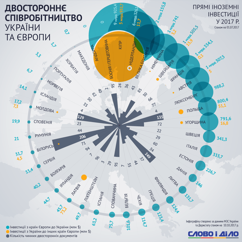 Показовими наведені вище цифри є в контексті того, що з перелічених вище країн далеко не завжди кількість міждержавних угод виявляється пропорційною обсягам торгівлі та інвестицій. Так, наприклад, за 206 міжурядових угод, що нині діють між Україною та Білоруссю, білоруські інвестиції до України в 2017 році склали всього 31,7 млн дол. До прикладу, Нідерланди, з якими у нас ратифіковано 36 міжурядових угод, цього року вже інвестували в нашу країну понад 6,3 млрд дол.