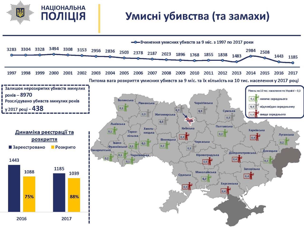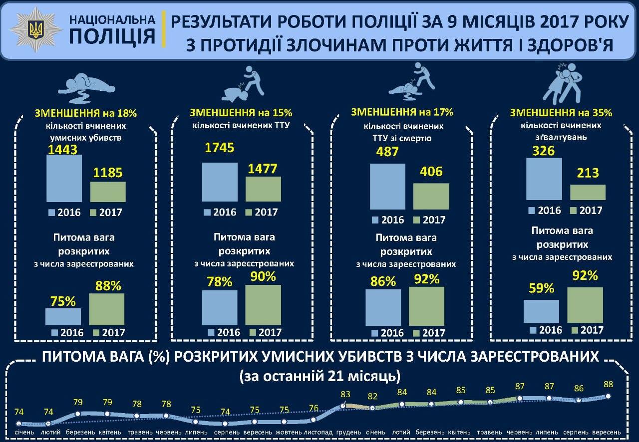 За девять месяцев текущего года произошло 1185 умышленных убийств и покушений. Это самый низкий показатель за последние 10 лет. Уровень раскрытия таких преступлений, с учетом прошлых лет, в этом году по стране составляет 88%. Об этом сообщил сегодня, 15 октября, первый заместитель главы Национальной полиции Украины - начальник криминальной полиции Вячеслав Аброськин.