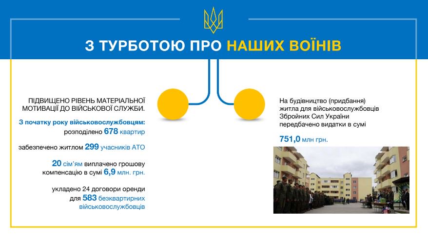 "С начала года военнослужащим распределены 678 квартир, обеспечено жильем 299 участников АТО. Дальше мы будем продолжать эту работу, 750 млн на строительство и приобретение жилья выделено для Минобороны в этом году", – подчеркнул премьер.