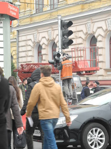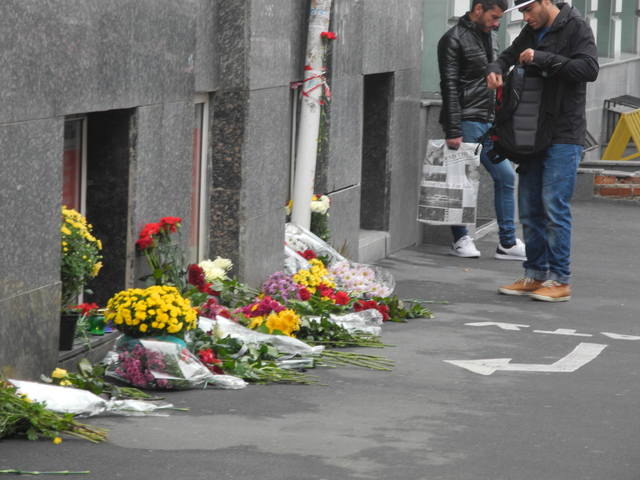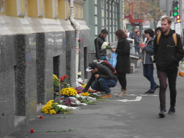 Цветы и лампадки несут харьковчане к месту аварии на ул. Сумской, которая произошла вечером 18 октября. Коммунальные службы уже убрали на месте ДТП - не осталось ни обломков машин, ни следов крови на асфальте. Рабочие восстанавливают светофор, который снес Lexus перед тем, как врезаться в людей.