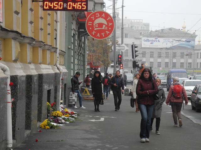 Харьковчане останавливаются перед местом, где вчера погибло пять человек. Спрашивают у прохожих, что случилось. Люди потрясены произошедшим.