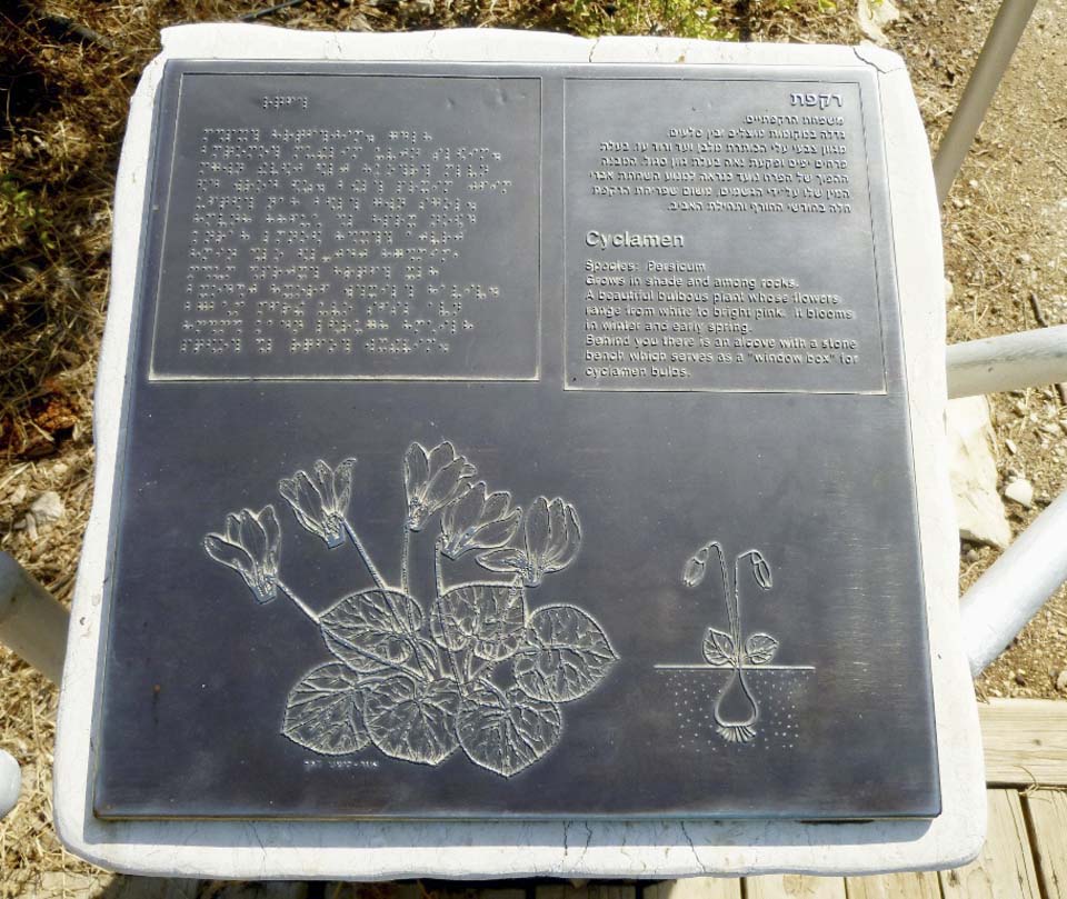 В поручни встроены металлические таблички, объясняющие на иврите, английском и на шрифте Брайля сведения о растительности и геологии леса Бен-Шемен, о фруктовых деревьях фермы и ее сельскохозяйственных сооружениях.